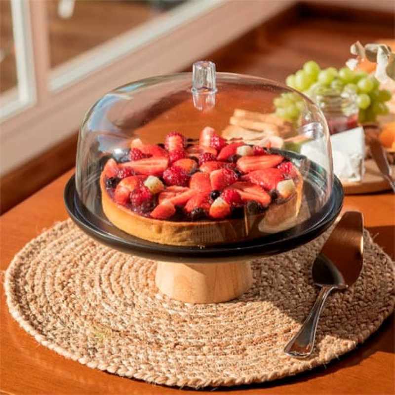 Seu design conta com base elevada com pé, que proporciona mais destaque à composição da mesa, e cúpula transparente que protege os alimentos contra poeira e insetos, ajudando a manter a frescura por mais tempo. Com 25cm de diâmetro, é ideal para bolos médios e diversas opções de doces.