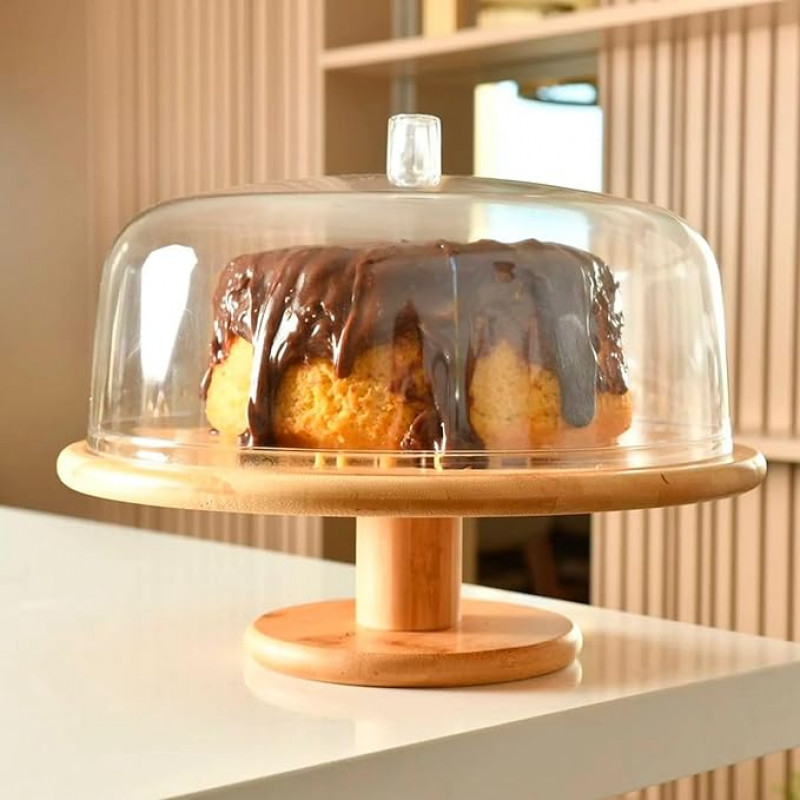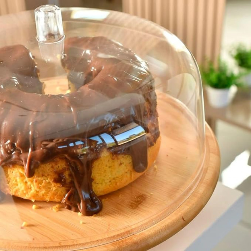 Com 27,5cm de diâmetro, é ideal para bolos médios, tortas e doces variados. A base com pé proporciona mais destaque à apresentação, enquanto a cúpula transparente protege os alimentos contra poeira e insetos, ajudando a preservar sua qualidade por mais tempo.