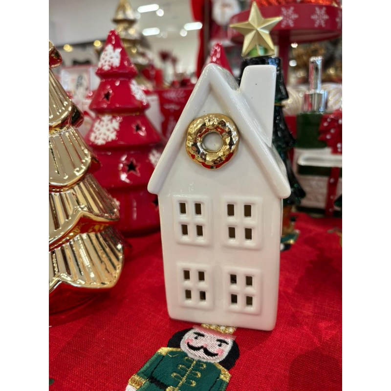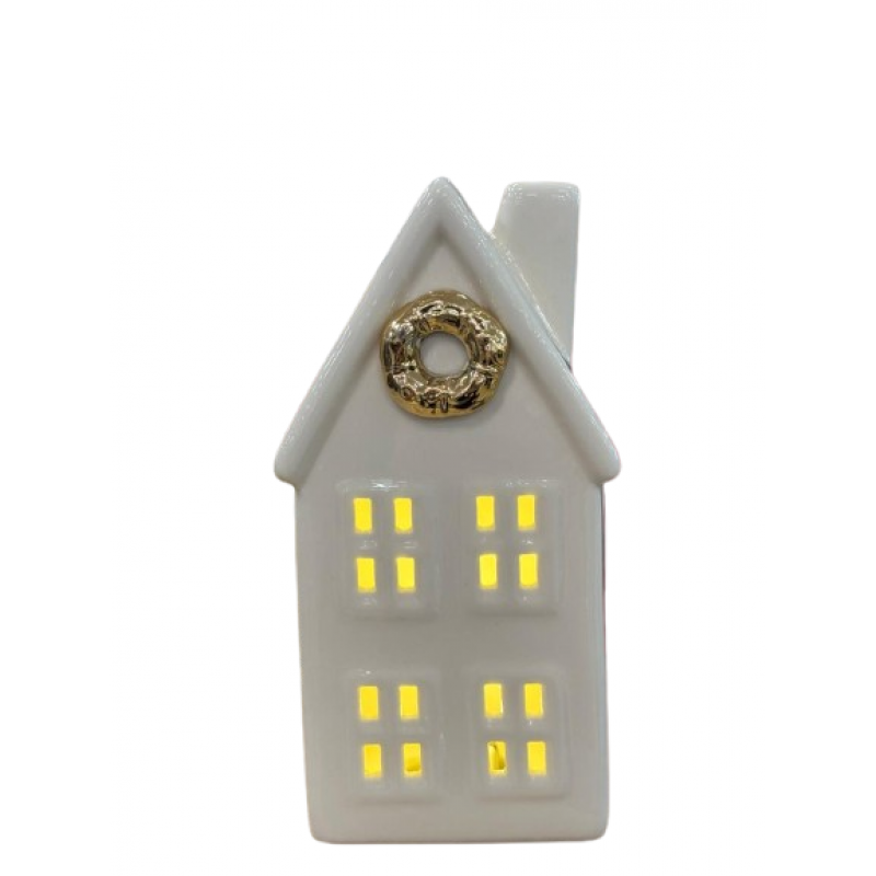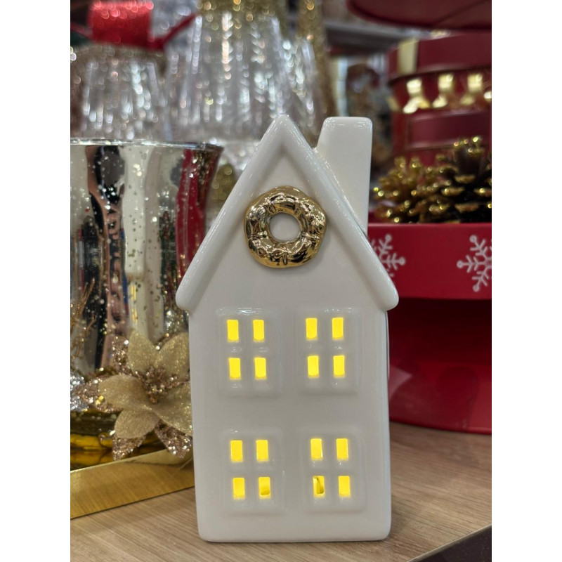 Ilumine sua decoração com charme e elegância com esta linda Casa Decorativa com Luz! Fabricada em cerâmica branca com acabamento brilhante, ela possui detalhes dourados e janelas iluminadas por LED, criando um efeito acolhedor e festivo. Ideal para compor ambientes natalinos, mesas decorativas ou cantinhos especiais da sua casa. Funciona com 2 pilhas tipo AA (não incluídas).