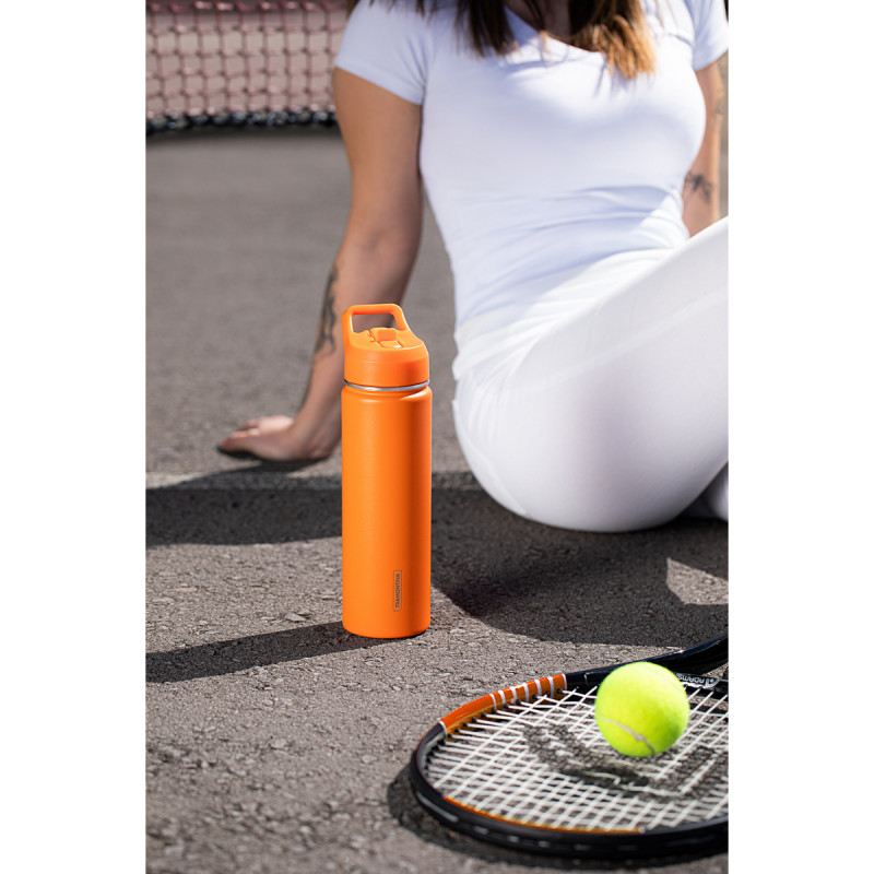 Seu design moderno na cor laranja oferece um visual vibrante e cheio de personalidade. O revestimento externo em pintura a pó garante maior resistência a riscos e melhor aderência. A tampa com canudo retrátil embutido facilita a hidratação sem a necessidade de inclinar a garrafa, tornando o uso mais prático e higiênico. Um item essencial para quem busca qualidade, estilo e durabilidade em uma única squeeze térmica.